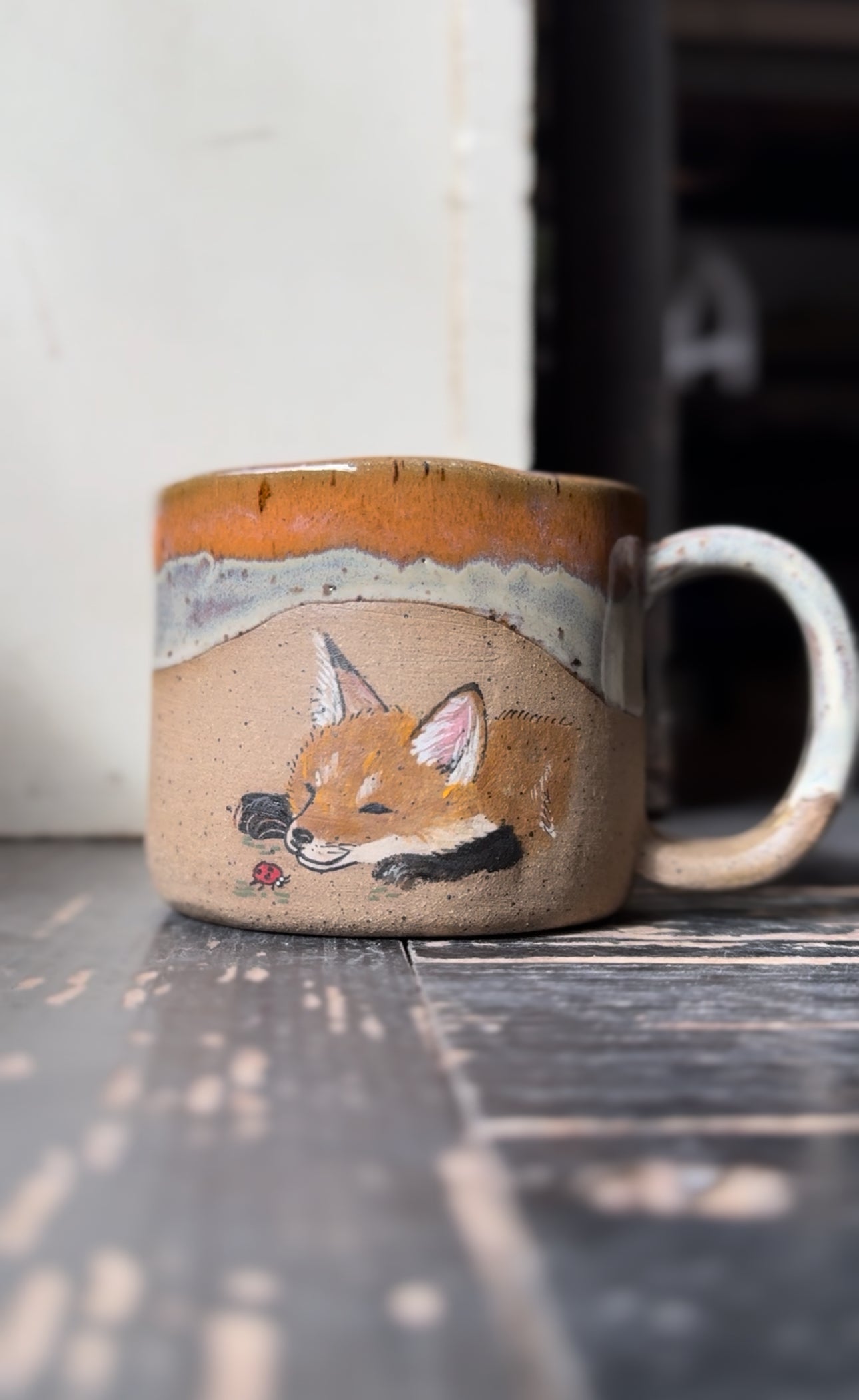 This handcrafted stoneware mug features a softly hand-painted woodland fox resting peacefully, eyes gently closed. A tiny ladybug nearby adds a sweet touch of whimsy—reminding us that even the smallest moments can hold great beauty.